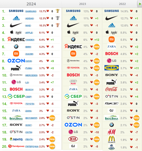 Всего сформировано 20 любимых брендов россиян в 2024 году. Первая четверка брендов — Samsung, Nike, Adidas и Apple — с 2017 года держит свои лидерские позиции в рейтинге Toп-20. Три российские технологические компании — «Яндекс» (5 место), «Озон» (8 место), «Сбер» (13 место), укрепили свое присутствие в Топ-20. Новичками двадцатки в 2024 году стали три российских продуктовых сети — «ВкусВилл» (16 место), «Лента» (19 место) и «Пятёрочка» (20 место). Покинули двадцатку — Audi, KIA и Gloria Jeans.