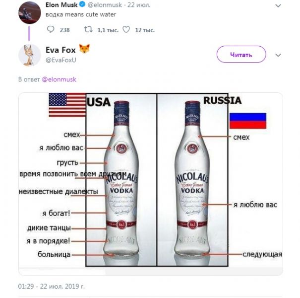 22 июля 2019 года Илон Маск в твиттере в очередной раз продемонстрировал свои знания русского языка. На этот раз он попытался объяснить, что такое водка: