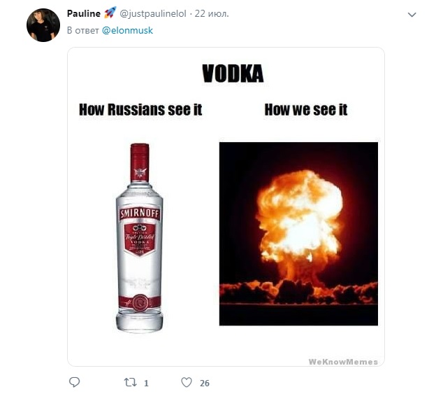 «Водка means cute water» (водка — значит милая вода.), — написал Илон Маск.