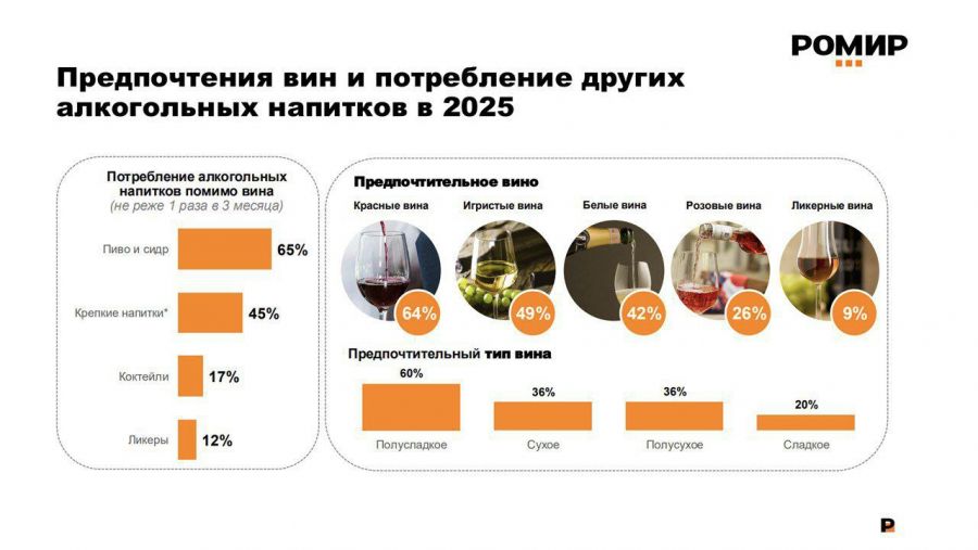 ← Обратно к новостямРОМИР: 60% россиян выбирают полусладкие вина