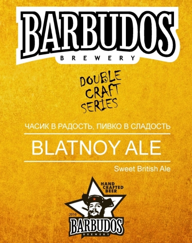Сладкий Британский эль BLATNOY – с девизом: «часик в радость, пивко в сладость». От крафтовой пивоварни БАРБУДОС — новая серия 2024 года — «дабл крафт». При варке были использованы аутентичные британские элевые дрожжи. Мягкие хмеля и солод выбранный нашим пивоваром специально для этого сорта.