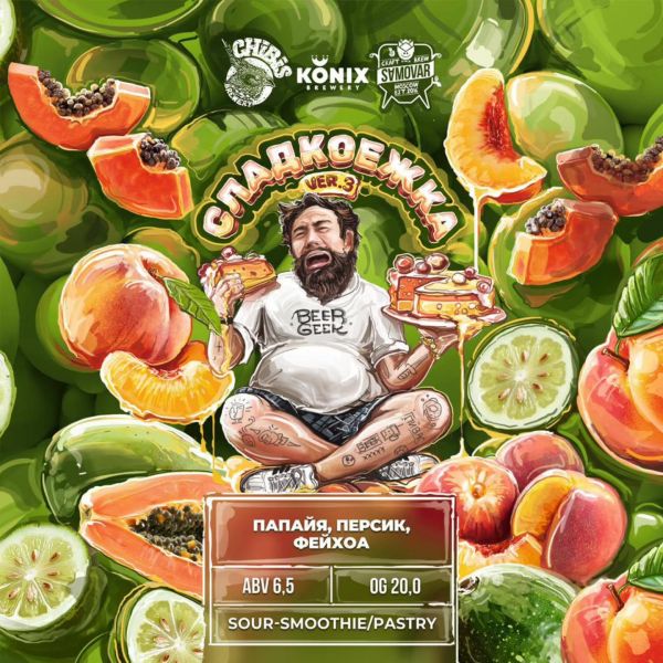 Традиции — дело хорошее, особенно дружеские. У пивоваров такая тоже есть: каждую весну  CHIBIS, Konix и Samovar Brew совместно готовят специальный витаминный коктейль: Pastry Smoothie «Сладкоежка». В этом году выходит уже третья версия этого кисло-сладкого саура, и на этот раз мы отдали предпочтение южным и тропическим фруктам: персик, фейхоа и папайя. Плотная, довольно густая, шелковистая текстура, вкус и ароматика натуральных фруктов заставляют совершенно забыть, что у этого смузи 6,5% алко — пейте ответственно!