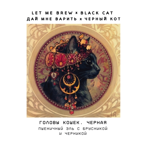 «Облик черной кошки окутан атмосферой тайны и элегантности. Ее профиль, как и в античных и ренессансных портретах, обрамлен роскошной темной шерстью, украшенной сложной диадемой. Композиция воплощает идеализированную красоту кошечки в узнаваемом стиле LET ME BREW, а колорит построен на теплых, землистых тонах с золотыми акцентами, усиливающими эффект свечения».
