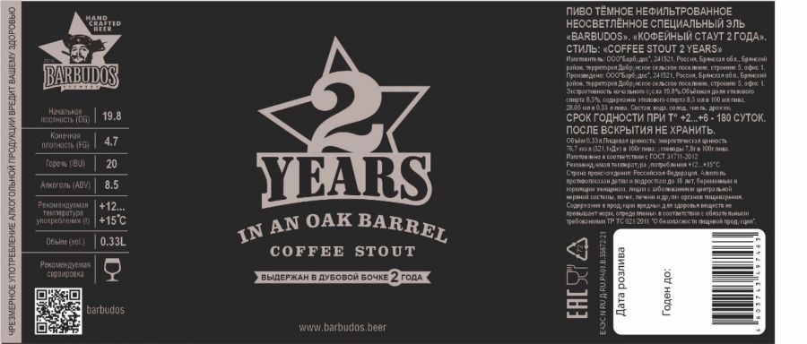 Кофейный стаут «2 года» действительно провёл два года в дубовых бочках из-под вина. Если честно, даже чуть больше. А ещё, если уж совсем честно, в этом кофейном стауте совсем нет кофе. Зато там есть хитрая комбинация солодов, которая позволяет обмануть языковые рецепторы. Так что можете предлагать собутыльникам застольную игру «угадай, какой там сорт кофе». И они будут очень удивлены, когда вы покажете на этикетке перечисление марок солодов.