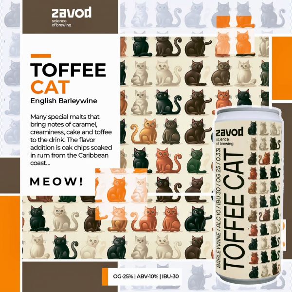Барливайн с десертным именем Toffee Cat. В составе много специальных солодов, привносящих в напиток ноты карамели, сливочности, бисквита и ириса. Вкусовым дополнением выступает дубовая щепа, вымоченная в роме с Карибских берегов… Meow!