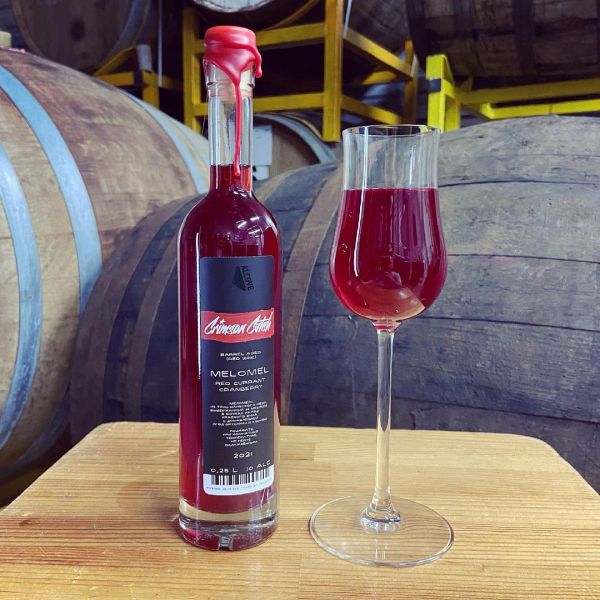 Меломель из тянь-шаньского мёда, выдержанный 25 месяцев в бочках из-под красного вина с добавлением ягод брусники и клюквы.