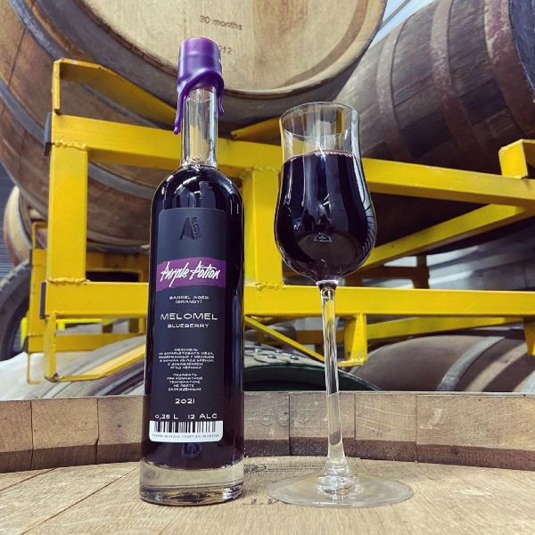 Меломель из эспарцетового мёда, выдержанный семь месяцев в бочках из-под бренди, с добавлением ягод черники.