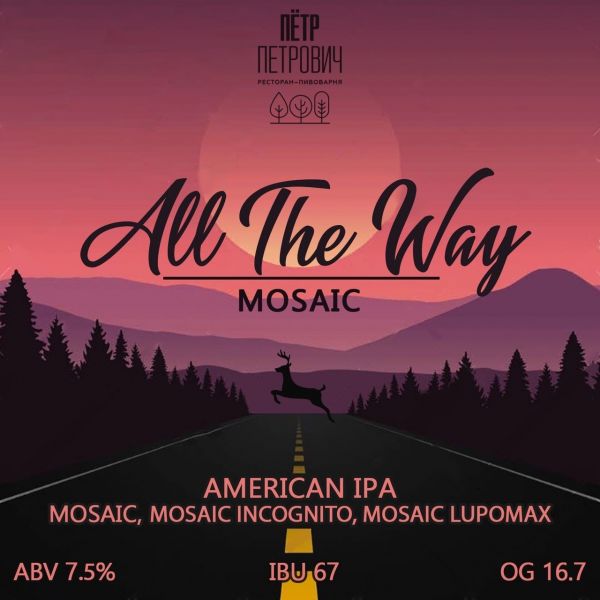 Пивовары продолжают путешествие по «хмелевым автострадам» в стремлении пройти их все от начала и до самого конца. Вторым хмелем, выбранным для «дорожной» линейки IPA в стиле западного побережья, стал популярный американский хмель Mosaic, который, как и ранее, добавили на всех этапах производства и во всех доступных вариациях: в виде хмелевых пеллетов, лупулиновой пыльцы, содержащейся на самых шишках, а также хмелевое масло из Mosaic. Этот родственник другого заокеанского хмеля Simcoe придал пиву не только травянистые, землистые и сосновые ноты, но и сложные комплексные оттенки тропических и цитрусовых фруктов, а также умеренную и слегка вяжущую горечь. Всё это, в совокупности с сухой солодовой базой, позволит вам прочувствовать Mosaic полностью и во всей красе.