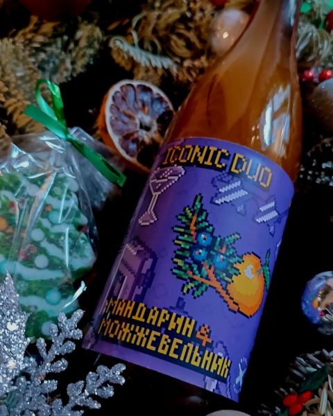 Полусладкий сидр из яблок урожая 2022 года с добавлением сока мандаринов прямого отжима и экстрактом ягод можжевельника.