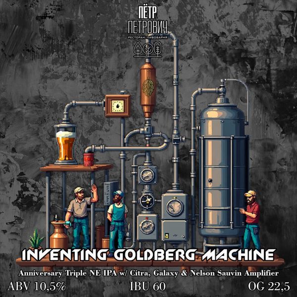 Этот стиль сложен во всех аспектах, как в рецептурных, так и в технологических. Именно поэтому новый сорт и первый в истории пивоварни тройной IPA получил название в честь небезызвестной Машины Голдберга, которая выполняет, казалось бы, лёгкую задачу предельно сложным путём. Ведь получение такого простого на первый взгляд продукта, как пиво, может даваться только лишь путём большого количества разнообразных операций.