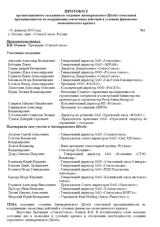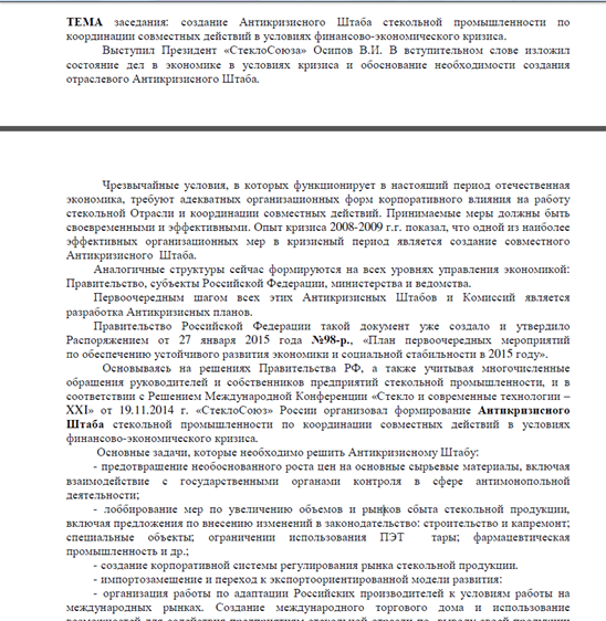 Согласно опубликованному документу одной из основных задач антикризисного штаба является «лоббирование мер по увеличению объемов и рынков сбыта стекольной продукции, включая ограничение использования ПЭТ–тары».