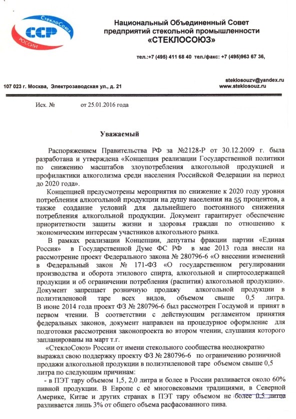 В январе 2016 года в СМИ снова появляются публикации (пример 1, пример 2), в которых авторы ссылаются на письма от имени «Стеклосоюза» в адрес Губернаторов с призывом запретить использование ПЭТ-упаковки.