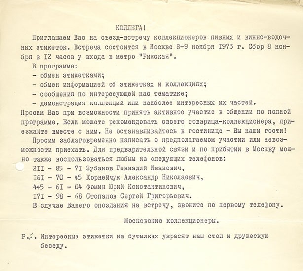 В 1973-м году на Сходне прошла первая встреча коллекционеров пивных и винно-водочных этикеток. Участников было еще так мало, что встреча проходила на даче одного из организаторов – Геннадия Зубанова. Такие встречи стали регулярными, росло число участников, стали проводиться региональные встречи на Украине и в Прибалтике.