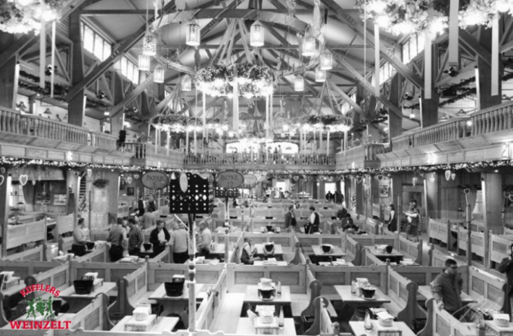 Войдите в Винный павильон Weinzelt – и вы будто попадете в иной мир. Внутри она выглядит как роскошный амбар с крышей из антикварного дерева, балконом и круглыми арками. Большая комната разделена на небольшие кабинетики, где компании могут наслаждаться приватностью, не переставая при этом быть частью толпы.