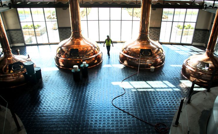 Каждому посетителю нужно проехать больше километра по извилистой дороге, мимо большого медного котла, каменных стен, множества цветов и деревьев. Предвкушение нарастает. Поднимемся вверх на холм — и с парковки можно заглянуть прямо внутрь пивоварни, благодаря стеклянным стенам от пола до потолка. И все это имеет смысл.