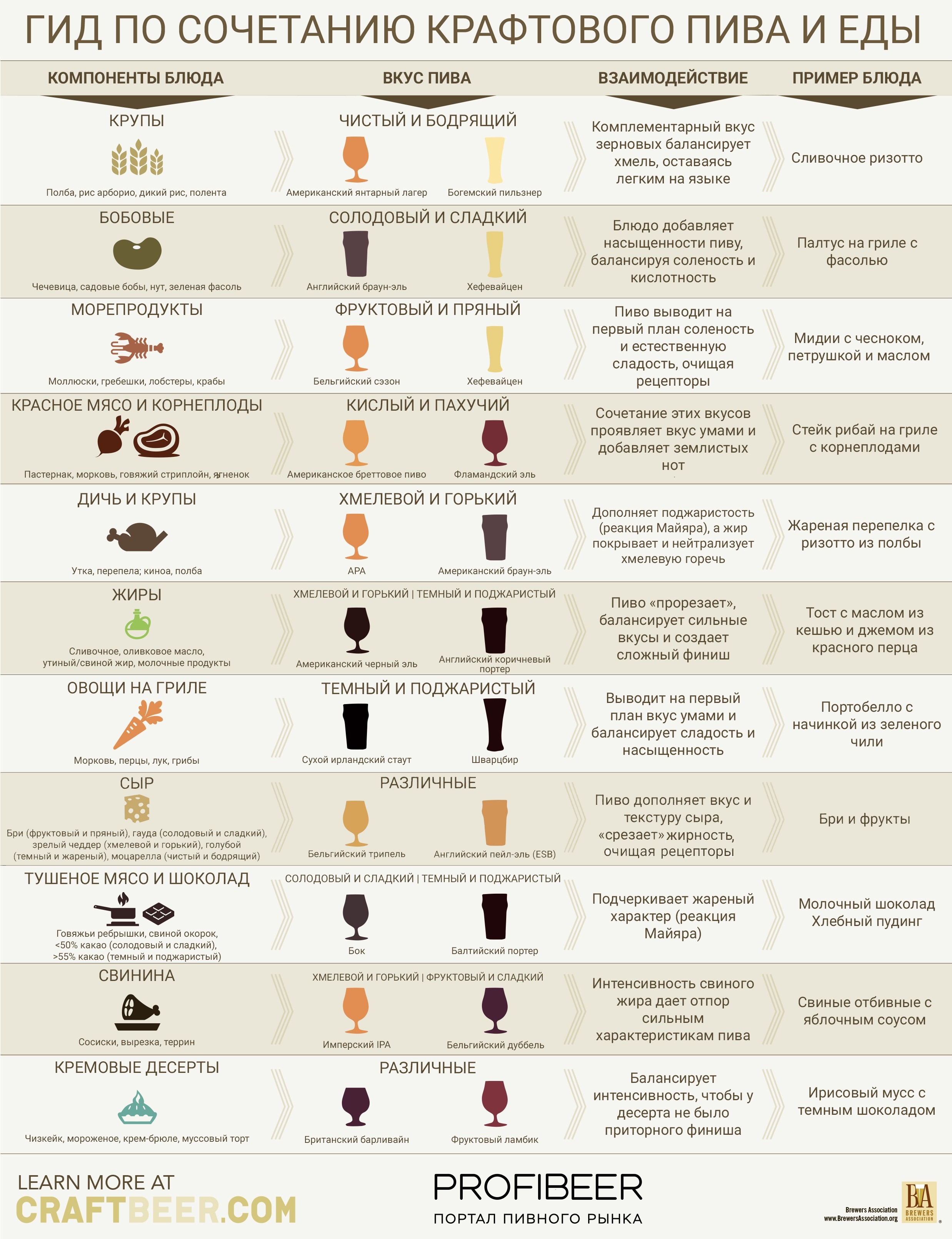 Brewers Association подготовила наглядное руководство для тех, кто хочет научиться правильно подбирать еду к различным видам пива (или наоборот). Возможно, предложенные авторами инфографики примеры блюд могут показаться слишком необычными, однако это всего лишь руководство к действию, которое помогает понять базовые принципы сочетаемости.