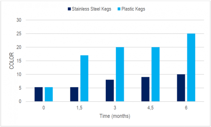 Пиво, хранившееся в кегах из нержавеющей стали, сохранило свой цвет на все 6 месяцев эксперимента. Пиво из пластиковых кег стало заметно темнее уже через 1,5 месяца после начала исследования. С каждым последующим месяцем изменения цвета в пластиковых кегах только усиливались.