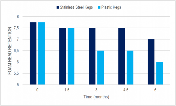 Пена пива, хранящегося в стальных кегах, поддерживалась на протяжении 4,5 месяцев эксперимента, однако в анализе через 6 месяцев она была менее устойчивой. Пена пива из пластиковых кегов обладала низким показателем удержания уже через 3 месяца.