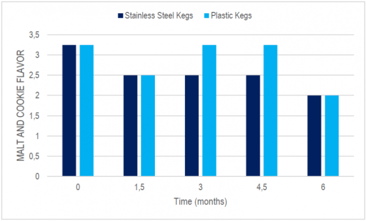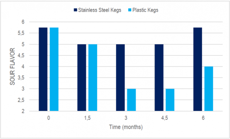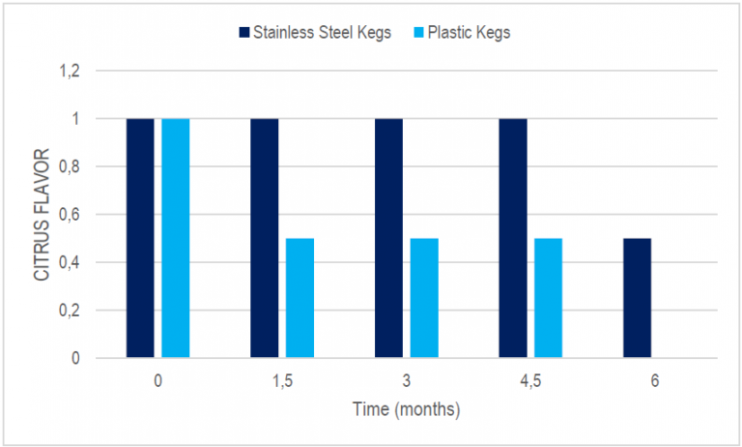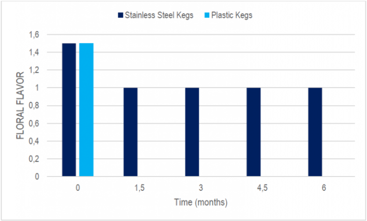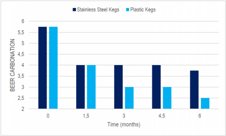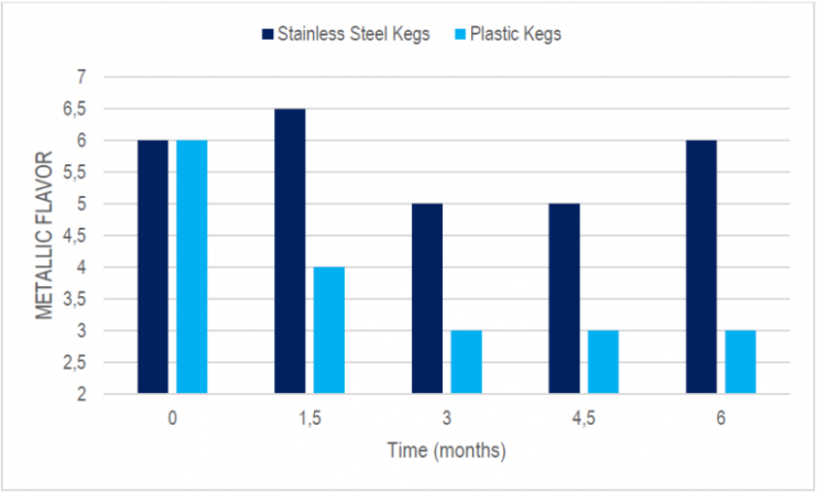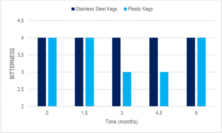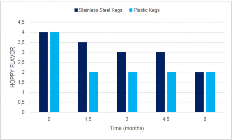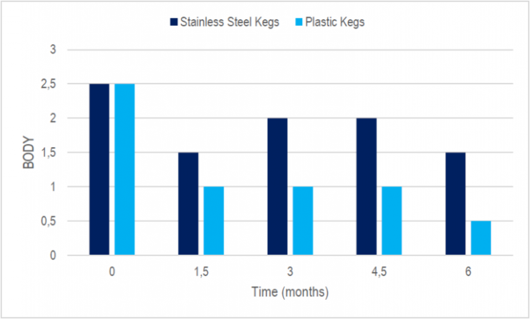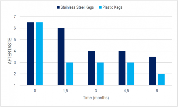 В пластиковых кегах показатель существенно снизился уже через 1,5 месяца. Далее различия между стальными и пластиковыми кегами были не такими существенными, однако пиво из нержавеющих кегов показало лучший результат.