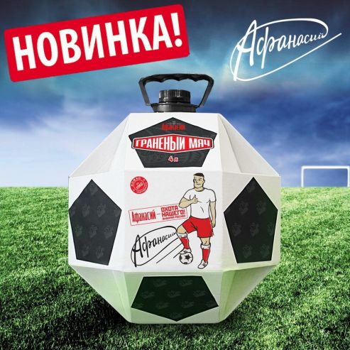 Картонная коробка по форме напоминает мяч. Видимо, холдинг решил таким образом привлечь внимание потребителя в свете предстоящего Чемпионата мира по футболу в это году. Выглядит «инновационное» изобретение «Афанасия» вот так: