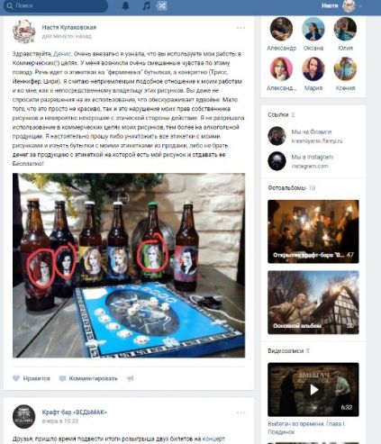 Белорусская художница Анастасия Кулаковская в своем паблике VK пожаловалась на красноярский бар «Ведьмак», который продавал пиво с ее рисунками на этикетках без указания автора.