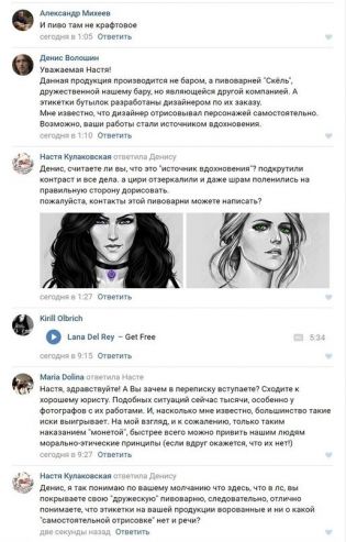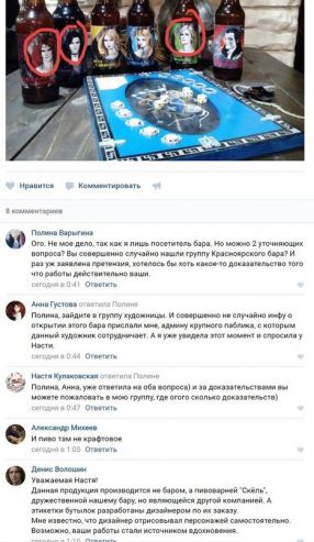 Найти какое-то упоминание пивоварни «Скёль» в сети не удалось. Тем временем под записью Анастасии на странице красноярского бара началось активное обсуждение случившегося – комментаторы просят художницу доказать, что рисунки действительно принадлежат ей, и обратиться за юридической помощью.