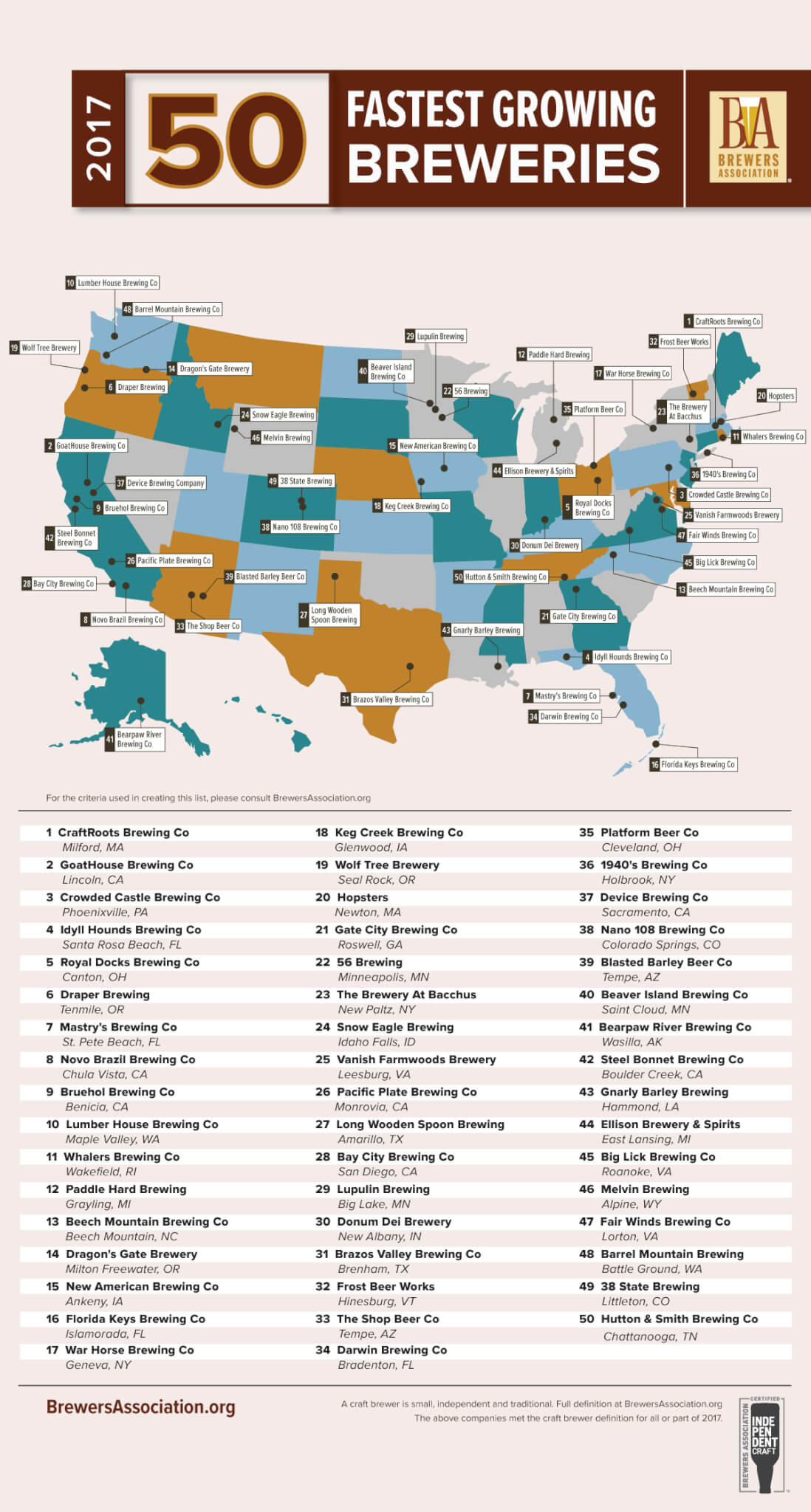 Лидером рейтинга за 2017 год стала пивоварня CraftRoots из Массачусетса — производство славится легкими элями на основе ягод и фруктов. Пивоварня была основана в 2014 году Марин Фабри, которая прежде работала в бостонском брюпабе и на пивоварне Pioneer Valley.