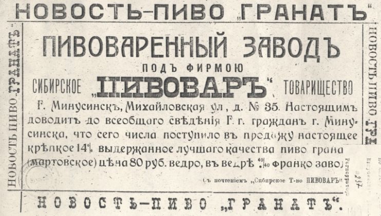 Пиво славилось на всю Сибирь, поставлялось в Иркутскую и Томскую губернии. К началу XX века в Енисейской губернии работало семь пивоварен, объединившихся в товарищество «Пивоваръ».