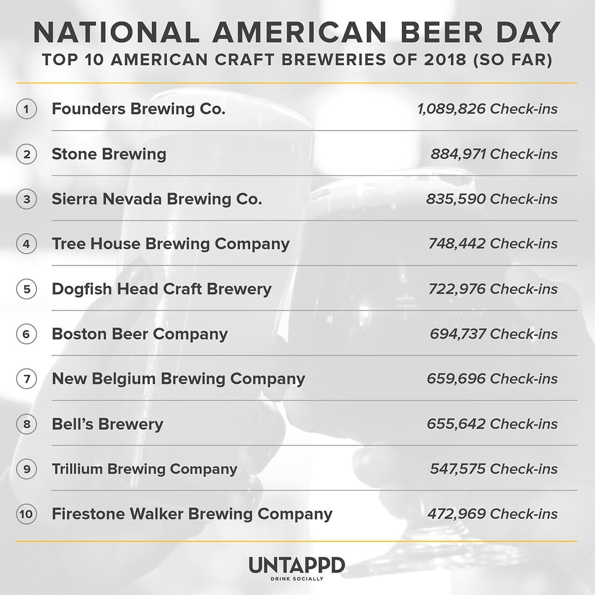 По числу чекинов в 2018 году лидером стала Founders — 1 089 826 чекинов. Далее следуют Stone (почти 885 тысяч чекинов) и Sierra Nevada (более 835 тысяч чекинов). Также в десятку вошли Tree House, Dogfish Head, Boston Beer, New Belgium, Bell's, Trillium и Firestone Walker.