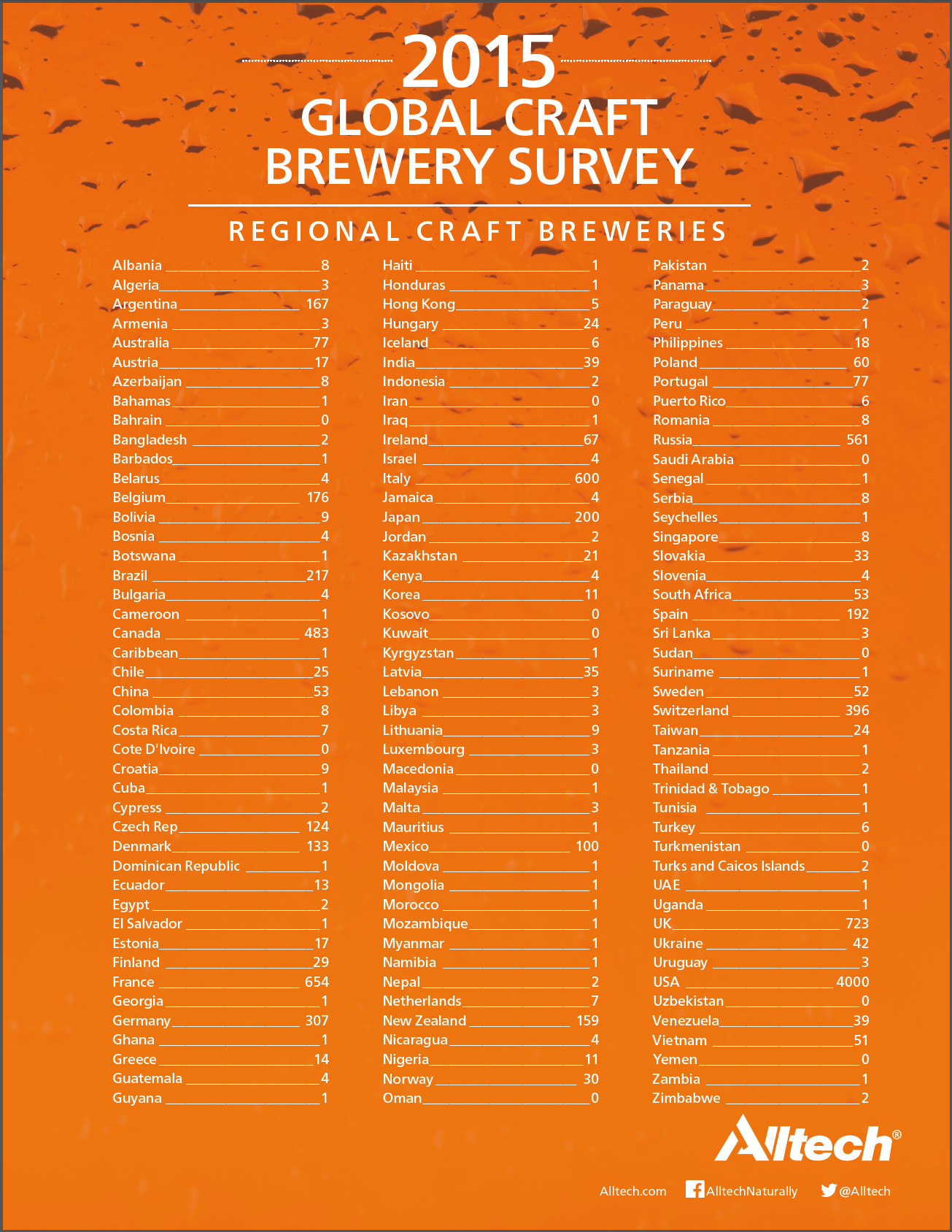86 процентов крафтовых пивоварен расположены в Северной Америке и Европе, причем Европа обходит Америку лишь на три пивоварни: в Европе — 4486, а в Северной Америке — 4483 пивоварни. При этом крафтовая отрасль США недавно пересекла отметку в 4000 пивоварен, продемонстрировав 20-процентный рост за год. Таким образом, США — абсолютный чемпион по числу пивоварен.
