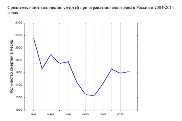 — Столь длительные новогодние каникулы, на мой взгляд, давно пора сократить, и еще лет пять-шесть назад я писал об этом президенту. Между почти двухнедельной чередой выходных дней, сопровождающихся непрерывными застольями, и алкоголизацией населения есть прямая корреляция, и существует совершенно ужасающая статистика, подтверждающая этот факт. На январь в России приходится годичный максимум заболевания алкогольными психозами, а в Москве, в частности, этот пик фиксируется 7 января (см. График среднемесячного количества смертей при отравлении алкоголем в России в 2004-2014 годах). Полагаю, что необходимость прервать пьянство и выйти на работу 4 или 5 января снизила бы эти негативные последствия. Конечно, вряд ли наше население будет вполне трудоспособным 4-5 января, зато сотни и тысячи людей сохранят рассудок от алкогольного помешательства и останутся живы.