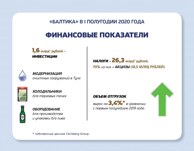 Объем инвестиций «Балтики» в I полугодии составил 1,6 млрд рублей. Большая часть этих средств была направлена на покупку холодильников для торговых точек, модернизацию очистных сооружений в Туле, а также оборудование для изготовления производства и упаковки безалкогольного пива. Налоговые отчисления компании в бюджет РФ в первой половине 2020 года составили около 26,3 млрд рублей, 70% из них — акцизы (18,5 млрд руб.).