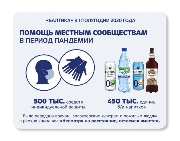 В марте «Балтика» развернула социальную кампанию «Несмотря на расстояние, остаемся вместе», направленную на помощь местным сообществам в условиях пандемии. В сотрудничестве с НКО, органами государственной власти и общественными объединениями компания помогла обеспечить 500 000 средств защиты и более чем 450 000 единиц безалкогольных напитков пожилых людей, волонтерские центры и врачей во всех регионах присутствия «Балтики». В мае компания объявила о планах к 2022 году обеспечить сбор и переработку не менее 50% объемов выпущенной на рынок упаковки по сравнению с 44% в 2019 году.