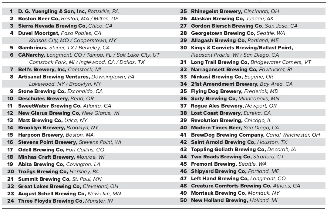 Первая тройка осталась неизменной: D. G. Yuengling and Son Inc, Boston Beer Co и Sierra Nevada Brewing Co. Занявшая в прошлом году четвёртое место New Belgium больше не участвует в рейтинге, так как перестала быть независимой пивоварней после сделки с Kirin. Dogfish Head, в прошлом году бывшая 13-й по объёму продаж, также не участвует в рейтинге самостоятельно, так как вошла в состав Boston Beer.