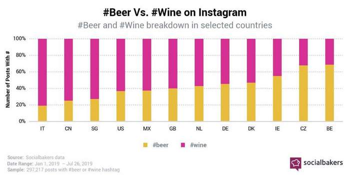Наконец, аналитики Socialbakers сравнили пивные и винные хэштеги, ориентируясь на страны, где варят пиво. В этом сравнительном анализе #пиво оказалось самым популярным в Бельгии, Чехии и Ирландии. Только в этих странах #пиво используется чаще, чем #вино. В Дании, Германии, Нидерландах, США и других странах вино в инстаграме всё же популярнее.