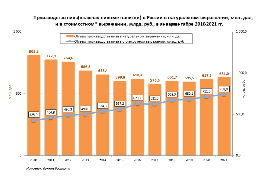 Жаркое лето помогло российским пивоварам удержать продажи в высокий сезон — с января по август 2021 года продажи увеличились по сравнению с аналогичным периодом прошлого года на 2%. Производство пива также выросло за первые три квартала на 2,2% до 631 млн дал. Помимо погоды ключевым драйвером рынка уже традиционно стал рост популярности импортного и безалкогольного пива.