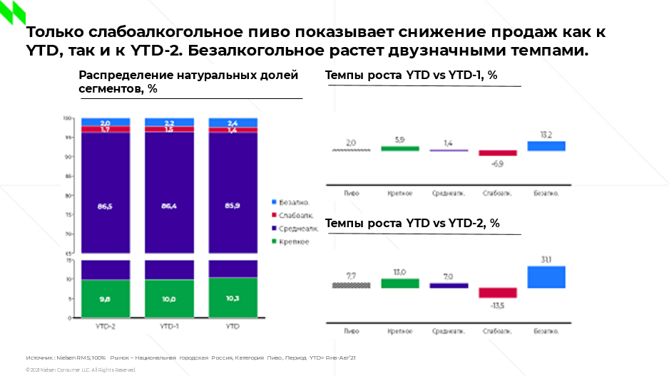 Ключевыми драйверами пивной категории уже традиционно стали безалкогольное и импортное пиво, а также собственные торговые марки (СТМ) крупных розничных сетей. С ростом популярности онлайн-ритейла растут и объемы продаж безалкогольного пива: сегмент вырос на 13,2% по сравнению с аналогичным периодом 2020 года, его доля на рынке алкоголя теперь занимает 2,4%. Категория безалкогольного пива увеличивается двузначными темпами уже несколько лет подряд и, судя по мировым тенденциям, все еще имеет хороший потенциал для дальнейшего развития.