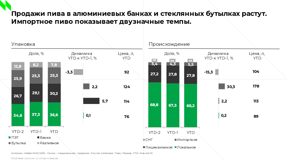 астут и продажи импортного пива, доля которого в России увеличилась на 1,2 п.п. — до 5,5%. Этот сегмент остается одним из самых востребованных у потребителей, хотя и наиболее дорогим на пивной полке. Средняя стоимость одного литра импортного пива по состоянию на август 2021 года составляла 178 рублей, по сравнению с августом 2020 года продажи выросли на 30,3%.