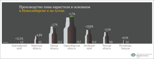 В Новосибирской области объемы производства также увеличились, но незначительно — на 2,7%. Что касается показателей отдельных компаний в регионе, то такую информацию предоставила только филиал «Балтика-Новосибирск». Так, за шесть месяцев 2016 года производство пива в филиале выросло на 14% по сравнению с аналогичным периодом прошлого года.