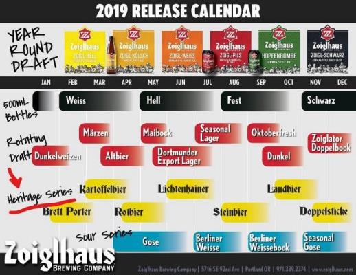В последние два-три года пивоварни начали использовать стратегический подход в производстве. Вместо того, чтобы выпускать точечные новинки, они создают целые «линейки» и выпускают расписание релизов на год вперёд. Как правило, они более информативны для производственной команды, дистрибьюторов и розничных партнёров. Однако, время от времени, в них появляется что-то интересное. Когда пивоварня Zoiglhaus опубликовала свой календарь, в нём нашлось место новой для пивоварни линейки пива — «Наследие» (на изображении она подсвечена красной стрелкой):