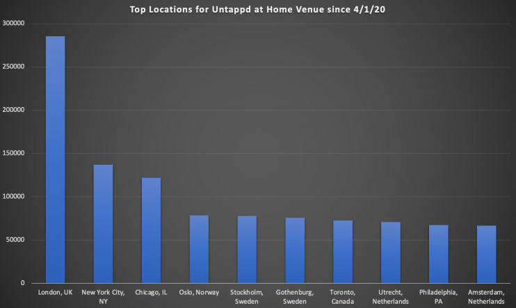 Авола отметил, что географические данные по чекинам в домашней обстановке примерно соответствуют статистике, которую они видят обычно. Но есть и отклонения. Например, норвежская столица Осло обычно не входит в топ-20 городов по числу чекинов на Untappd, а вот по чекинам в Untappd at Home она заняла четвёртое место. И, хотя большинство пользователей Untappd живут в США, в топ-10 городов по числу чекинов вошли лишь три американских — Нью-Йорк, Чикаго и Филадельфия. Опережает их Лондон — как по общему числу чекинов, так и по числу уникальных пользователей. Также в топ-10 попали Стокгольм, Гётеборг, Торонто, Утрехт и Амстердам. Такие изменения статистики, по мнению Аволы, подчёркивают рост популярности Untappd и развитие крафтового рынка в мире.
