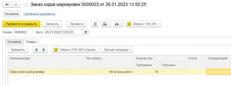 Для заказа кодов маркировки в СУЗ в решении создаётся документ «Заказ кодов маркировки», в котором указывается организация, тип продукции, номенклатура и требуемое количество кодов.