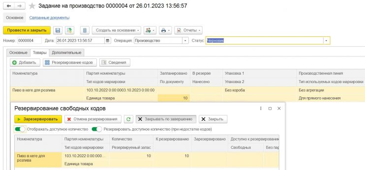 Для конкретной позиции «Задания на производство» осуществляется резервирование кодов для их дальнейшей распечатки на принтере.