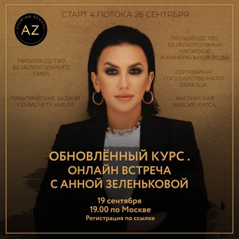 В честь старта нового потока Анна Зеленькова проведёт 19 сентября бесплатный вебинар, на котором подробно расскажет обо всех новинках курса, осветит некоторые актуальные темы, касающиеся современной ситуации в сфере пивоварения, и ответит на все интересующие вопросы. Все участники после вебинара получат полезные бонусы и специальную цену на обучение. Регистрация на вебинар по ссылке.
