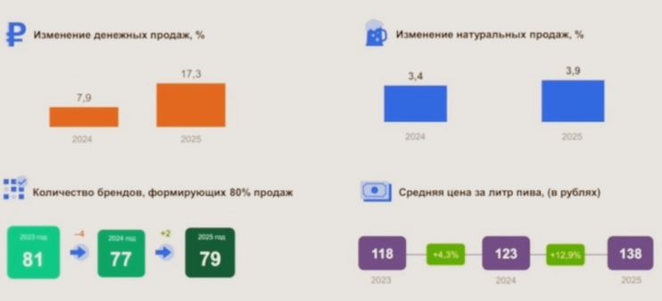 Что касается цвета пива, то потребитель в 2025 году в основном отдает предпочтение светлым сортам (94,8%), темное в объеме продаж составляет 2,9%, полутемные сорта (2,4%) становятся драйверами изменения спроса, за последний год доля их продаж выросла на 26,6%.