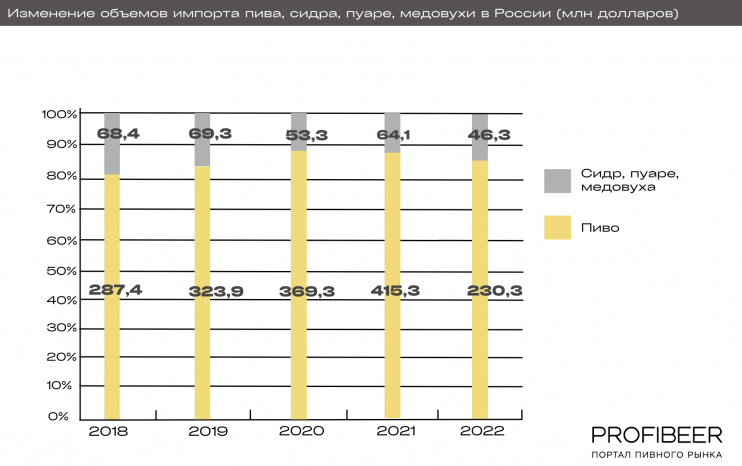 Изменение объемов импорта пива, сидра, пуаре, медовухи в Россию (млн долларов)