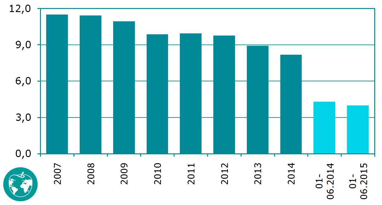 — Один из основных вопросов при исследовании сегмента пищевого тарного стекла— это уровень использования стеклянной упаковки на рынках-потребителях и вытекающая из этого потребность в стеклотаре. В России основную роль в формировании спроса на стекло традиционно играет рынок пивоваренной продукции. Однако в последние годы объёмы выпуска на нём постоянно снижались — на фоне ужесточения государственной политики регулирования алкогольных рынков, неблагоприятной макроэкономической конъюнктуры, ухудшения демографии. По прогнозам экспертов, к концу 2015 года спад производства пива по отношению к уровню 2007 года составит порядка 30%.