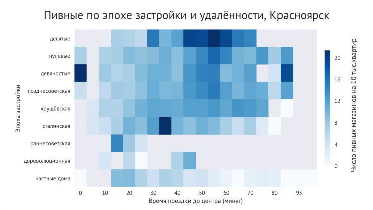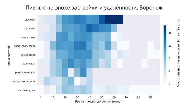 Во многих городах удельное количество пивных больше всего в домах последних лет и удалённых от центра.