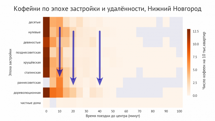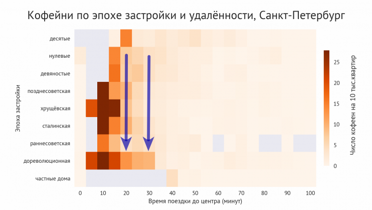 Дома дореволюционной и раннесоветской застройки лучше обеспечены кофейнями, чем дома более поздних эпох на том же расстоянии от центра. То есть традиционная (дореволюционная) планировка города лучше работает как центр и создаёт активность.