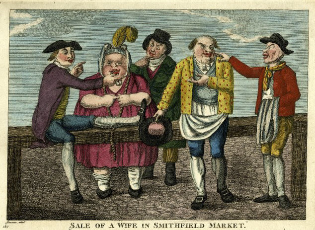 В 2019 году все это представляется ужасно женоненавистническим. Менефи отметил, что некоторые сделки были обусловлены жалобами на бесплодие женщины или ее «нытье», подразумевая тем самым, что мужчине нужна более молодая или более безропотная партнерша. Визуализацию подобных сцен также очень сложно переварить: в сатирических карикатурах той эпохи жены изображались на оживленном лондонском рынке Смитфилд в накинутых поводьях, за которые их крепко держали мужья — так же, как если бы они перевозили скот, — или с лентами, которыми их привязывали к новым «владельцам». Некоторые из этих карикатур были «срисованы» с самой жизни.